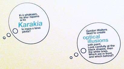 An example? Close by a classic Gordon Walters painting there's a cartoon think bubble (it feels more like a public programmes intervention than curatorial) telling us that Walters “liked to create optical illusions with paint” while on the other side of the room a label quotes Walters specifically telling how he added grey to his work to stop the image “jumping around too much.” The idea that people would see his works as optical illusions like those by British artist Bridget Riley always concerned Walters. His intention was to refine and balance the components of his paintings rather than agitate them. Besides why not let people think about what Walters was about for themselves rather than sum him up ... and get it wrong?